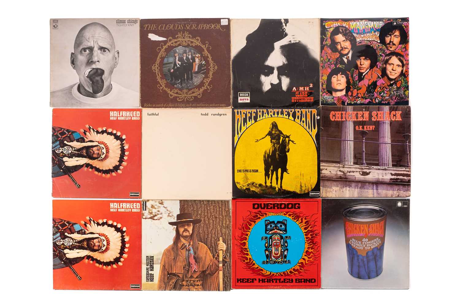 Twelve rare original vinyl LPs comprising "Chicken Shack- 40 Blue Fingers Freshly Packed and Ready To Serve", "Chicken Shack- Ok Ken?", "Circus Maximus- Neverland Revisited", "Clark Hutchinson- A=MH2", "Coven- Blood On The Snow", "The Clouds Scrapbook- Riches in Search of a Place to Belong", "Climax Chicago- Tightly Knit", two "Keef Hartley Band- Halfbreed", "Keef Hartley- Lancashire Hustler", "Keef Hartley Band- Overdog", "Keef Hartley Band- The Time Is Near", and "Todd Rundgren- Faithful".