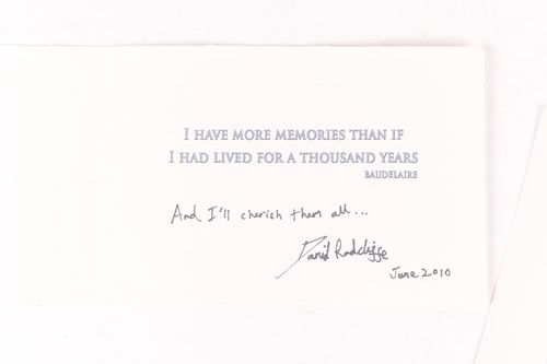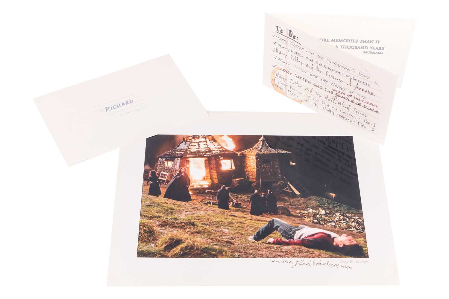 Harry Potter and the Deathly Hallows Part 2 (2011) Daniel Radcliffe Signed crew Thank you card, with the eight printed Harry Potter film titles ticked, beneath the header"To Do:", further printed inside the card, 'Sept 2000-June 2010', and a quote by French poet, Baudelaire, 'I have more memories than if I had lived for a thousand years', and Signed 'And I'll cherish them all . . .Danile Radcliffe june 2010', further printed to reverse "Created Especially, Exclusively, Elementarily, & Evidently for Daniel Radcliffe by Empty Biker", contained within the original envelope with the crew member's name printed name to front. (2)