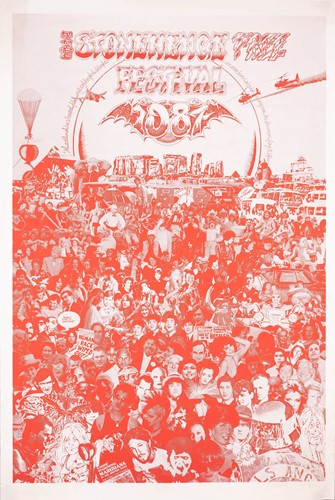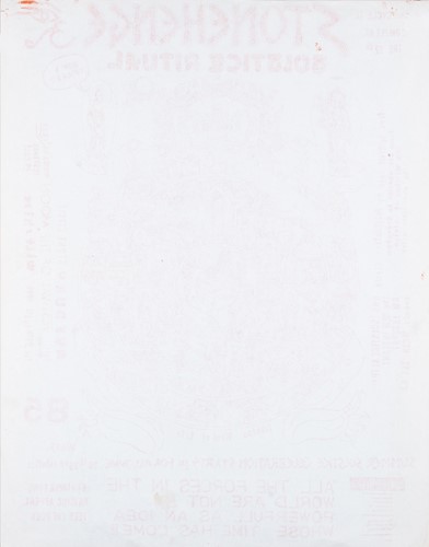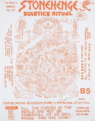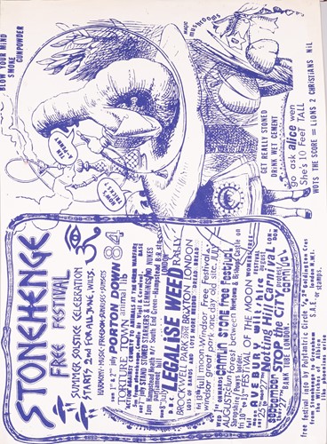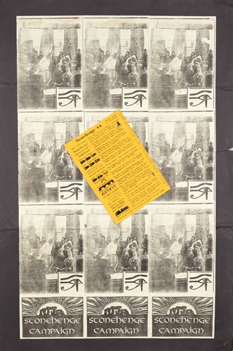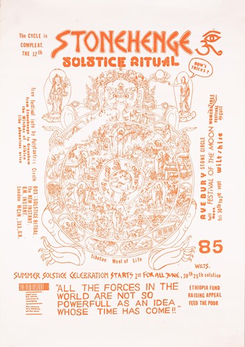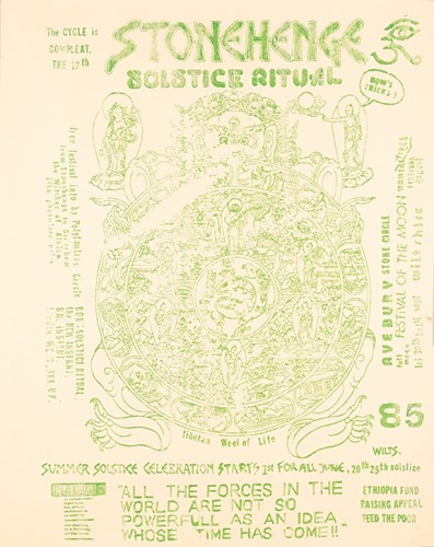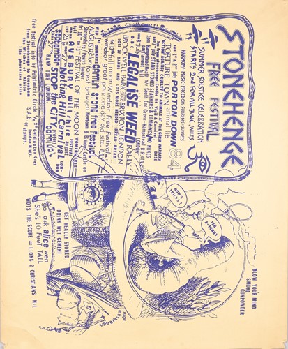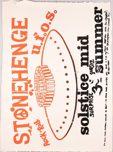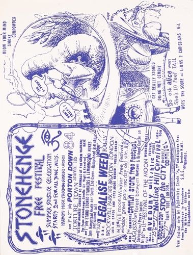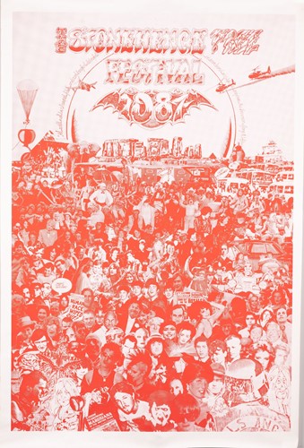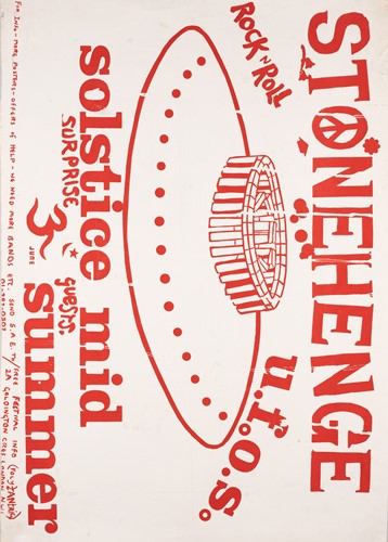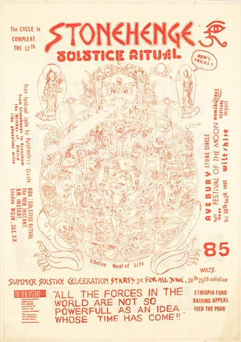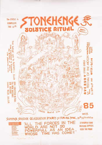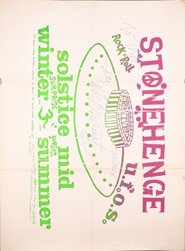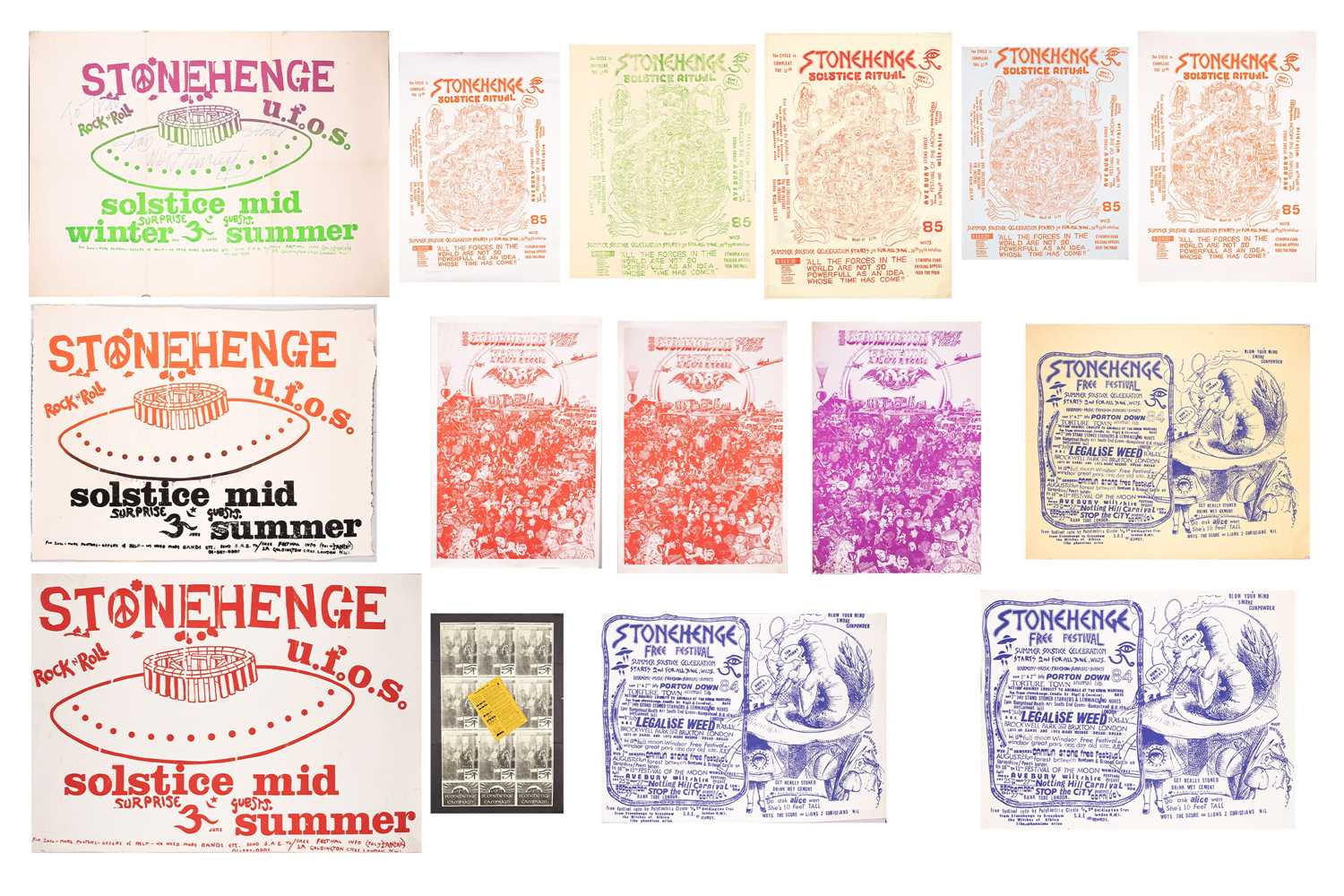 The Stonehenge Free Festival: a collection of twenty-five posters of varying ages comprising eleven "Stonehenge Solstice Ritual 1985" (printed in various sizes/colors), six "Stonehenge Free Festival 1984" (two in purple and four in red print- 51cm x 76cm), four"Stonehenge Free Festival 1984" advertising additional events such as the Windsor Free Festival and the Cantlin Stone Free Festival, by Roger Hutchinson (printed in various sizes/colors), five "Stonehenge: Rock n' Roll U.F.Os" advertising Summer and Winter Solstice events, one signed (printed in various sizes/colors), and a collage of flyers for the "Stonehenge Campaign".