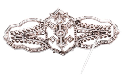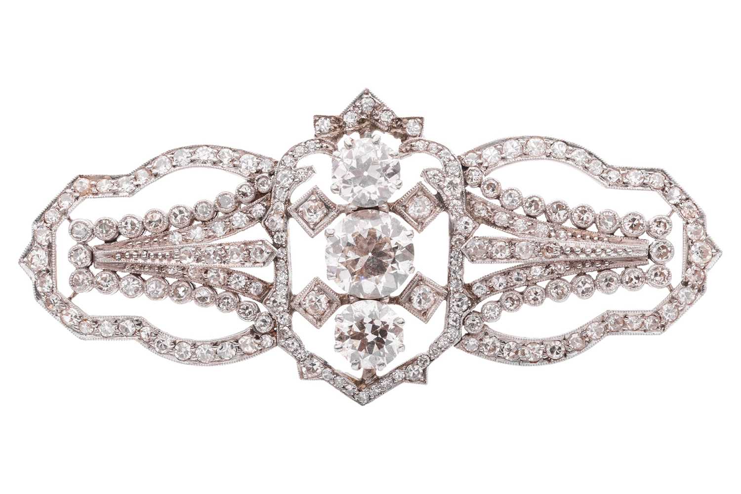 An early 20th century diamond-set brooch; set with a central old European-cut diamond of approximately 1.81ct, flanked above and below by a further old European-cut diamond of 0.93ct and a transitional-cut of 0.94ct, to a cartouche-shaped surmount, intricately pierced with geometric openwork and set with a variety of round-cut diamonds ranging in size from 2.25mm to 1.0mm, set within collet and bead mounts with millegrain detailing, fitted with a hinged pin with C-scroll catch to reverse; white metal mount surface testing as platinum, white metal fittings surface testing as 18ct, brooch measuring 6.5 cm x 2.2 cm, weight 17.4 grams.
