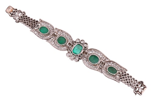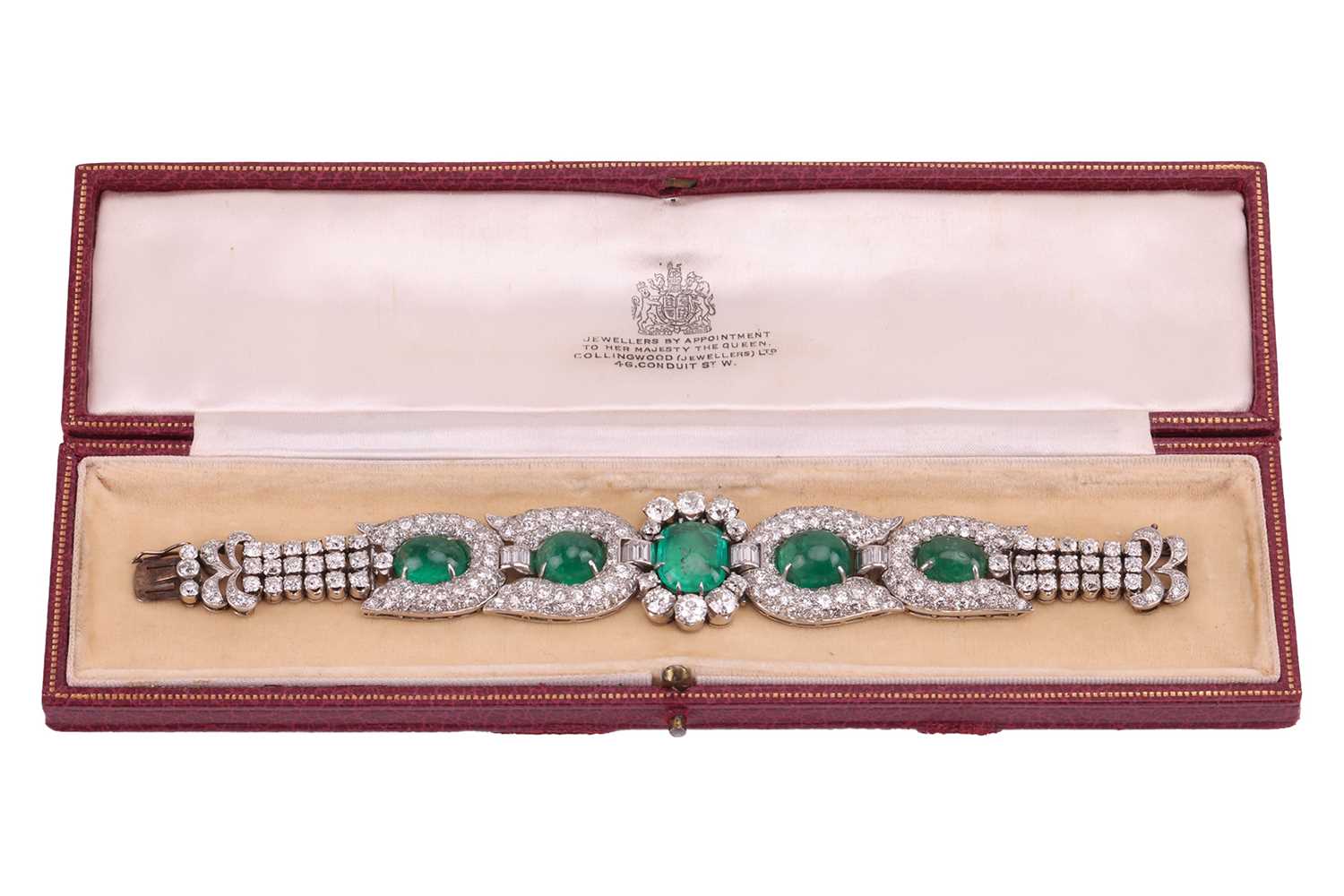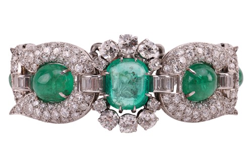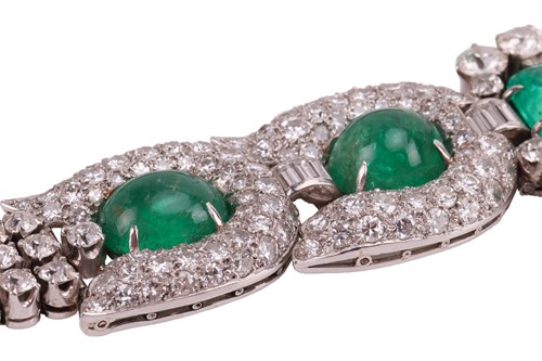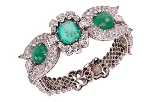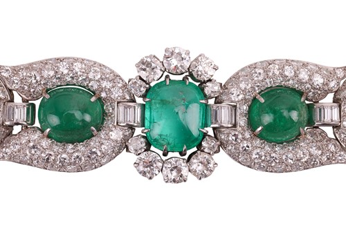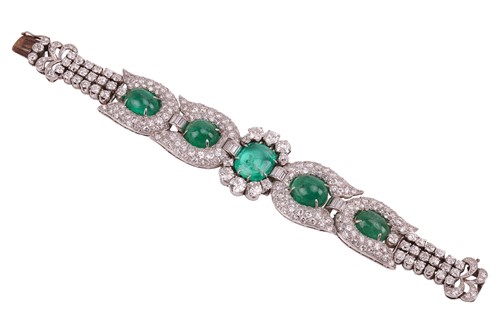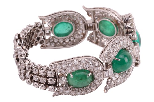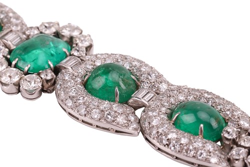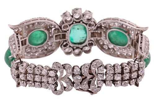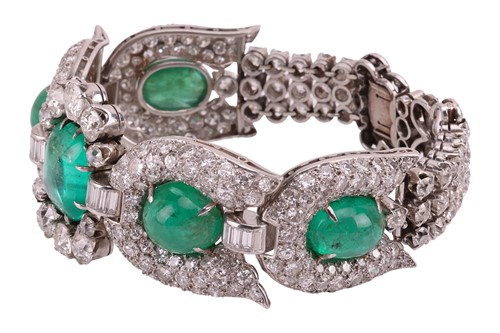 A mid-20th Century emerald and diamond bracelet, comprising a central claw-set cushion-shaped emerald cabochon of 14.1mm x 12.0mm x 6.0mm, encircled by claw-set graduating old-mine and old-European cut diamonds, the central emerald flanked either side with a curved link, channel-set with four baguette-cut diamonds, connecting the central segment to two stylised tulip-shaped sections, featuring lightly scalloped edges and pavé-set with graduating old-European cut diamonds, the tulip forms each encircling a claw-set oval-shaped emerald cabochon, further linked by another diamond-set curved link to a smaller section of replicated tulip design, also pavé-set with old-European cut diamonds and encircling an oval-shaped emerald cabochon, the smaller tulip forms accented by a single claw-set old-European cut diamond to the end of the segment, the bracelet highlighted at each end with a triple-row of six claw-set old-mine cut diamonds, the bracelet terminated at each end by a motif of scrolled design, pavé-set with single-cut diamonds, the bracelet completed with a concealed box clasp and additional safety catch, the thumbpiece featuring a single column of three graduating collet-set old-mine cut diamonds, the bracelet measuring approximately 17.0cm in length, 2.7cm at widest point, accompanied by Collingwood Ltd box, 63.3 grams.