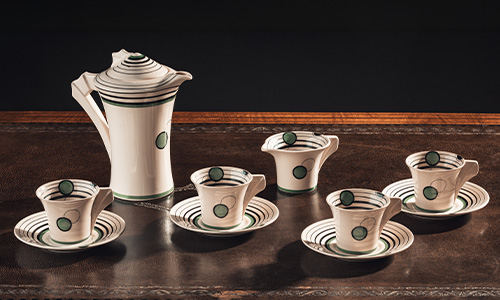 Her pieces were often hand-painted by teams of decorators, resulting in lively, expressive designs that continue to captivate collectors today. Patterns such as Sunburst, Crocus, and Autumn are instantly recognisable, while rarer shapes and experimental designs are particularly sought after at auction.
